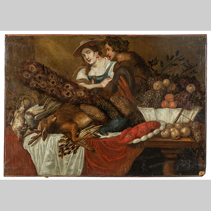 Scuola fiamminga inizi sec.XVIII 'Natura morta con personaggi' olio