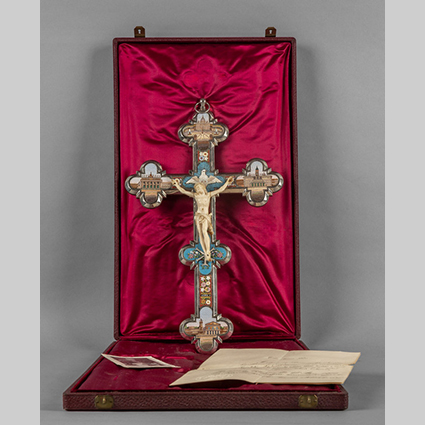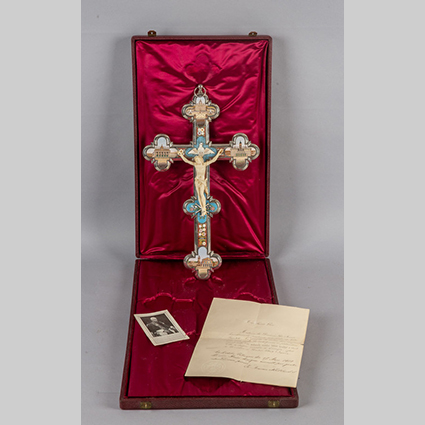 Crocefisso in metallo argentato con micromosaici nei quattro canti raffiguranti vedute di Roma Cristo in avorio marino correlato da una lettera intestata al Santo Padre e ricevuta dello Stato del Vaticano 17-05.1909 con il timbro di Pio X