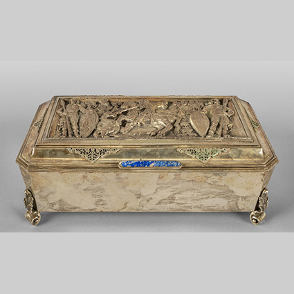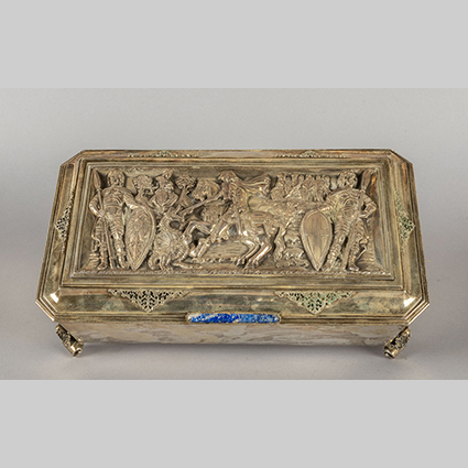 Grande scatola in argento sbalzato sul coperchio placca raffigurante San Giorgio ed il drago presa in lapislazzulo