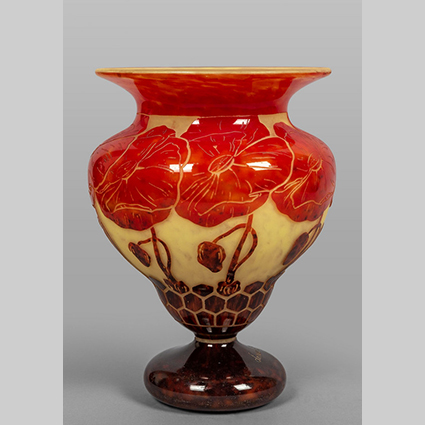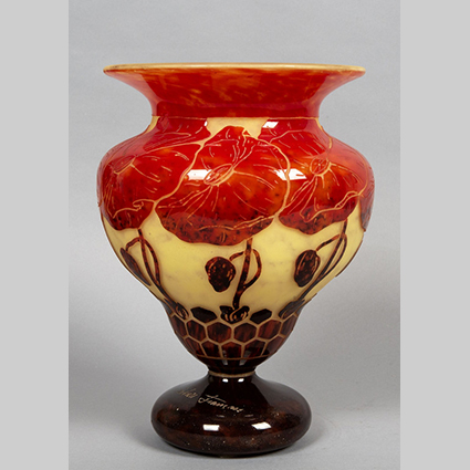 Vaso in vetro lavorato all'acido nei toni del rosso marrone e giallo f.to alla base Le verre Francais