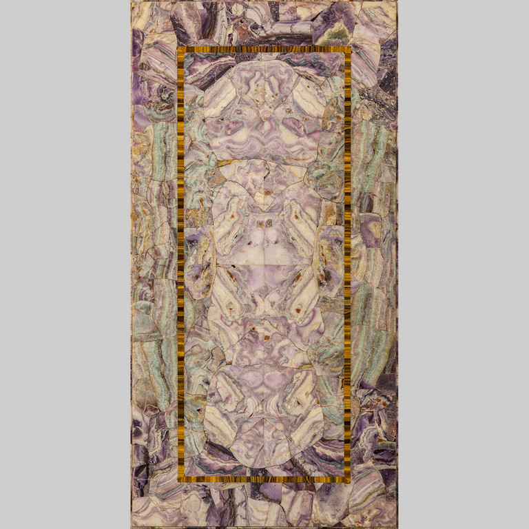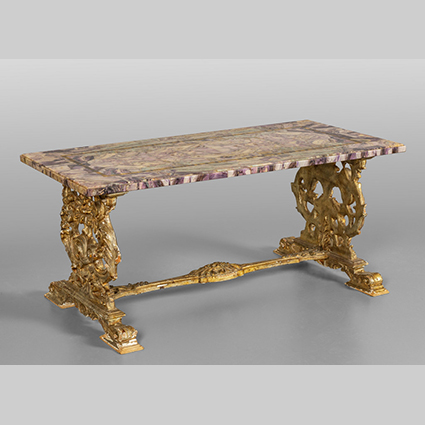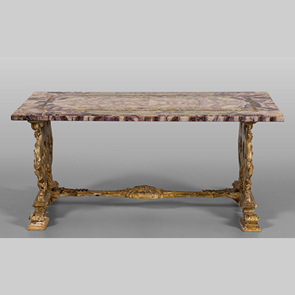 Tavolino da sofà piano in breccia violacea sostegno in legno intagliato e dorato (elementi antichi)