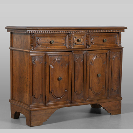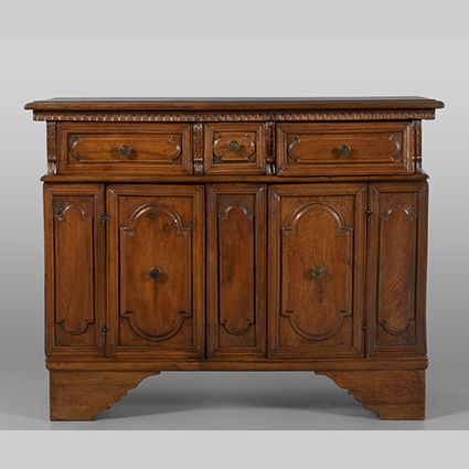 Credenza in stile a due sportelli e tre cassetti in noce