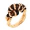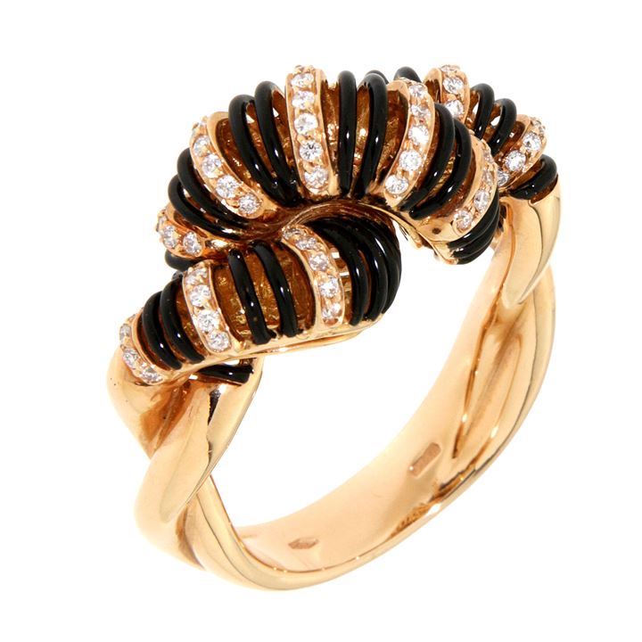 Anello in oro giallo, sommità traforata ad intreccio, con smalto nero e diamanti taglio brillante per complessivi ct 0,45 ca