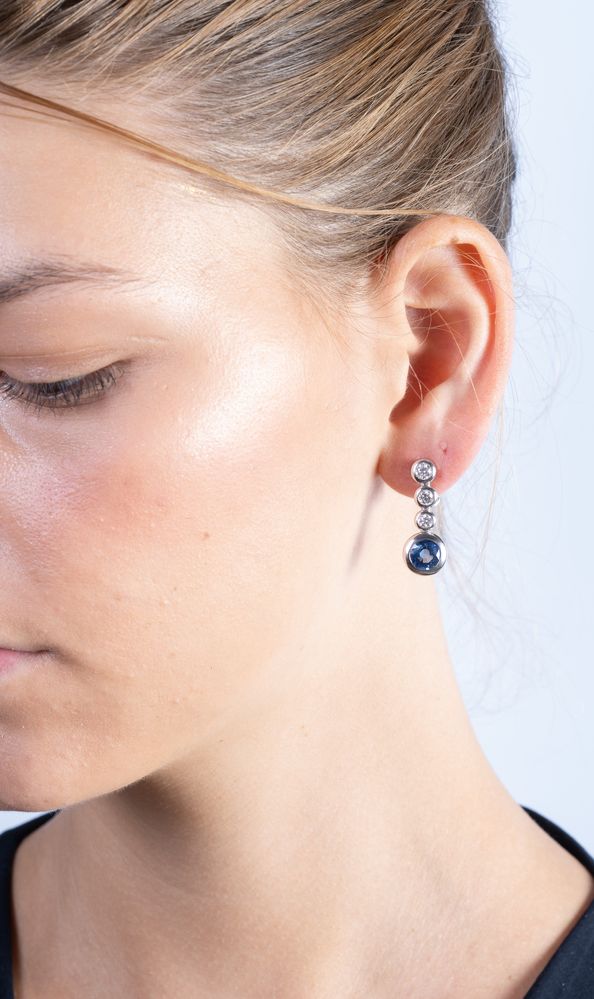 Ciascuno realizzato come una linea pendente di elementi rotondi snodati incastonati con diamanti e culminanti con uno zaffiro rotondo sfaccettato, peso stimato dei diamanti 1,10 ct circa, zaffiri 3,50 ct circa. Marcati “Schreiber”.