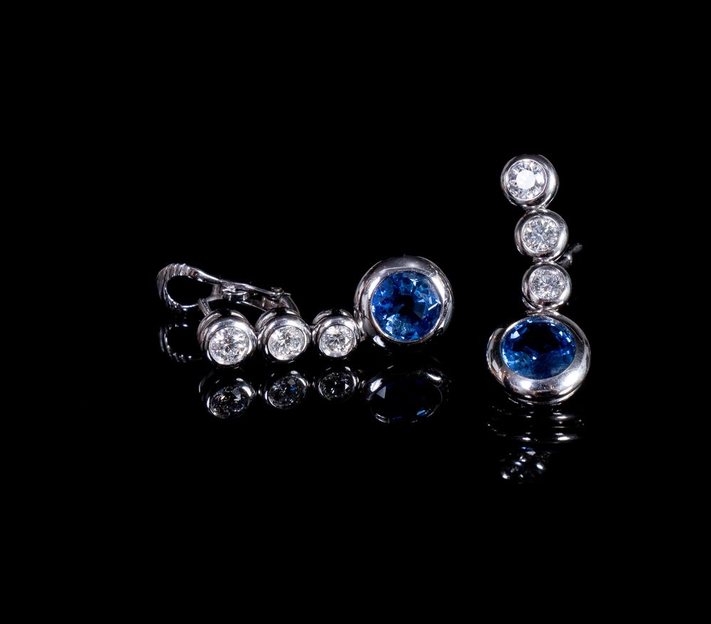 ORECCHINI IN ORO, DIAMANTI E ZAFFIRI, SCHREIBER Ciascuno realizzato come una...