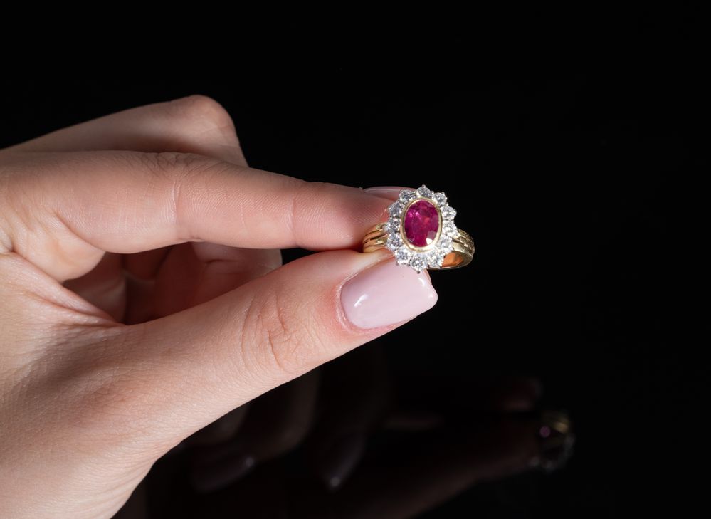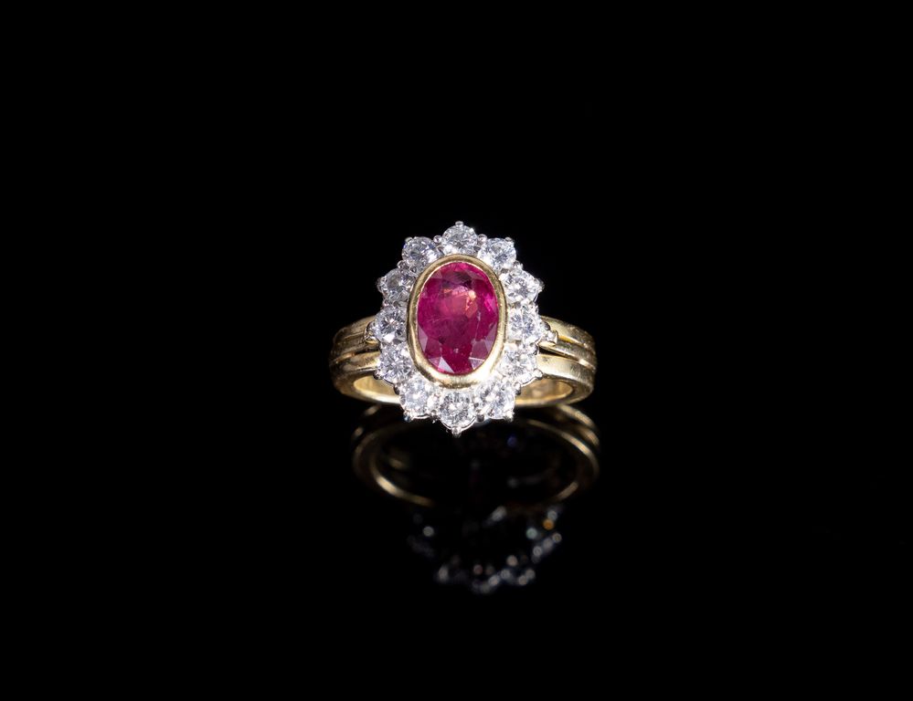 In oro giallo e bianco, centrato da rubino ovale sfaccettato del peso stimato di 1,80 ct, posto entro cornice di diamanti per un peso complessivo stimato di 0,85 ct, qualità G/VVS.