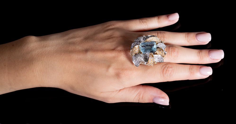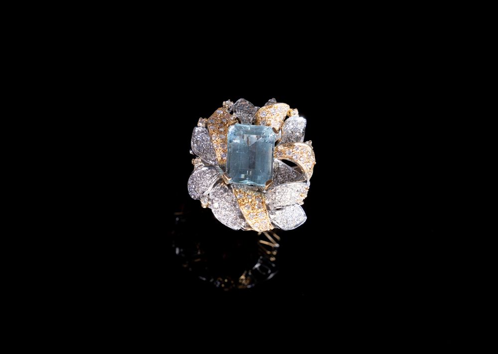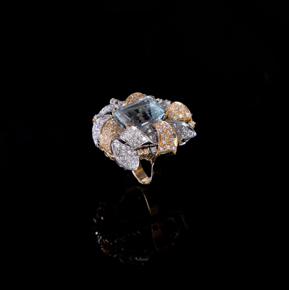 Anello in oro bianco e giallo 18K, centrato da grande acquamarina ottagonale di 12 ct circa, posta entro decoro floreale a pavé di brillanti.