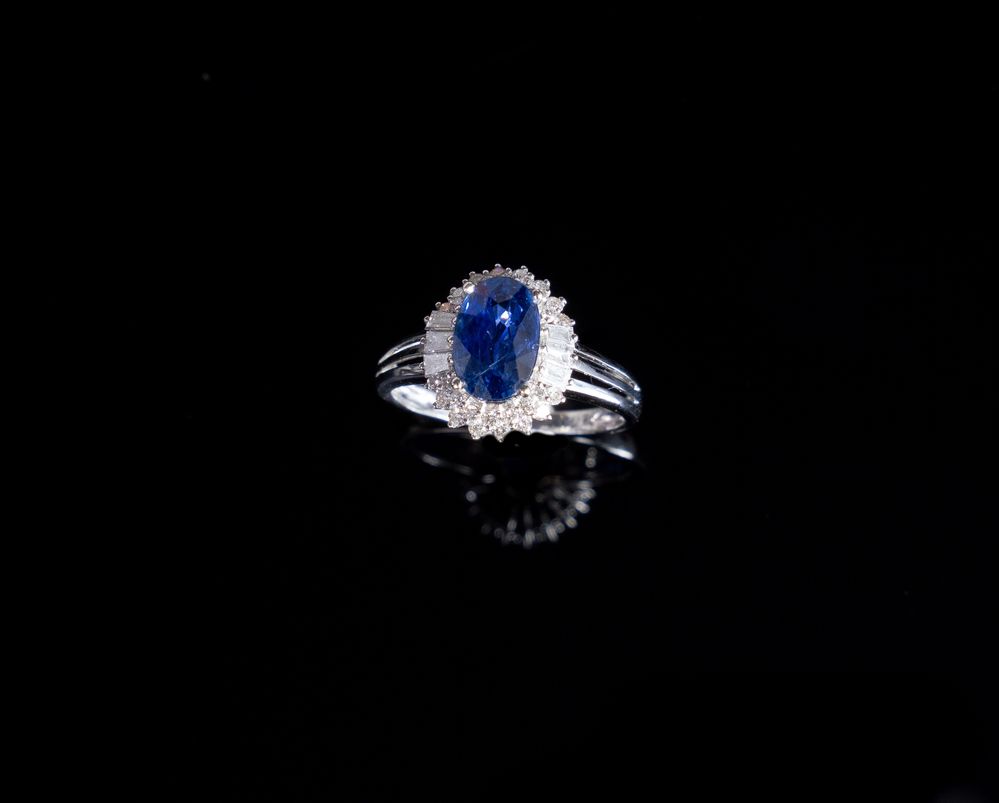 Anello in oro bianco 18K, centrato da zaffiro blu di 1.50 ct circa entro corolla di diamanti di taglio brillante e baguette per complessivi 0.60 ct circa.