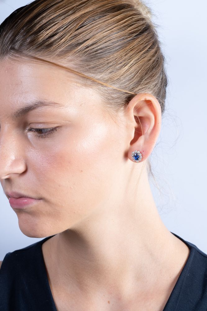 Orecchini in oro bianco 18K, ciascuno realizzato con zaffiro di qualità extra, taglio ovale, posto entro corolla di diamanti. Carature stimate: diamanti 0,85 ct circa; zaffiri 1,65 ct circa.