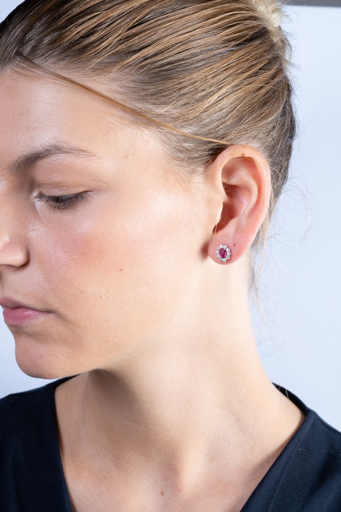 Orecchini in oro bianco 18K, ciascuno realizzato con rubino taglio ovale, posto entro corolla di diamanti. Carature stimate: diamanti 0,45 ct circa; rubini 0,90 ct circa.