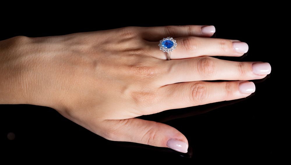 Anello in oro bianco 18K realizzato con zaffiro blu del peso stimato di 2.60 ct, posto entro corolla di diamanti per un totale di 0.70 ct circa.