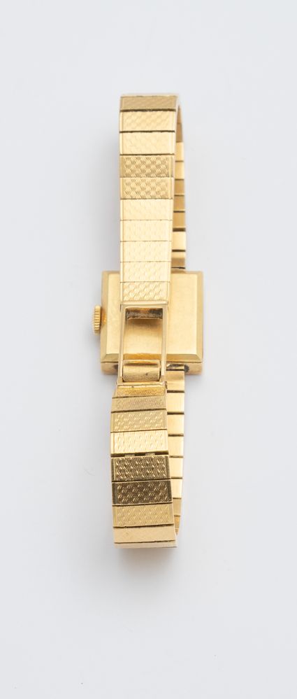 Orologio da polso per signora in oro giallo 18K, cassa quadrata con fondello a scatto, vetro minerale. Quadrante avorio marcato "Patek Philippe Geneve", indici a bastone, lancette ad ago. Movimento a carica manuale. Bracciale a nastro integrato, decorato a lavorazione fiorentina ed inciso con firma della Maison nella deployante. Dimensioni 15 x 16 mm circa. Peso complessivo 37,0 grammi.