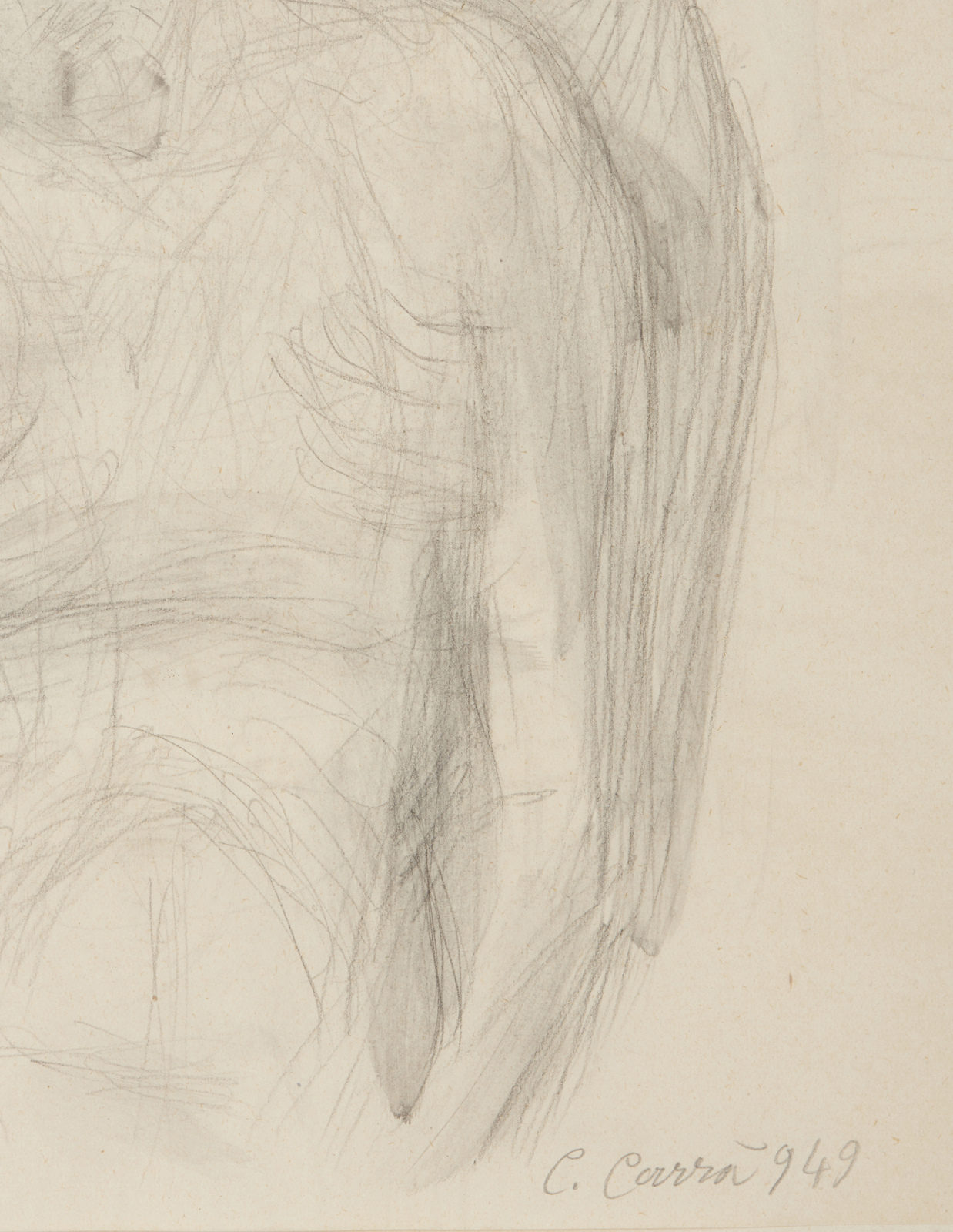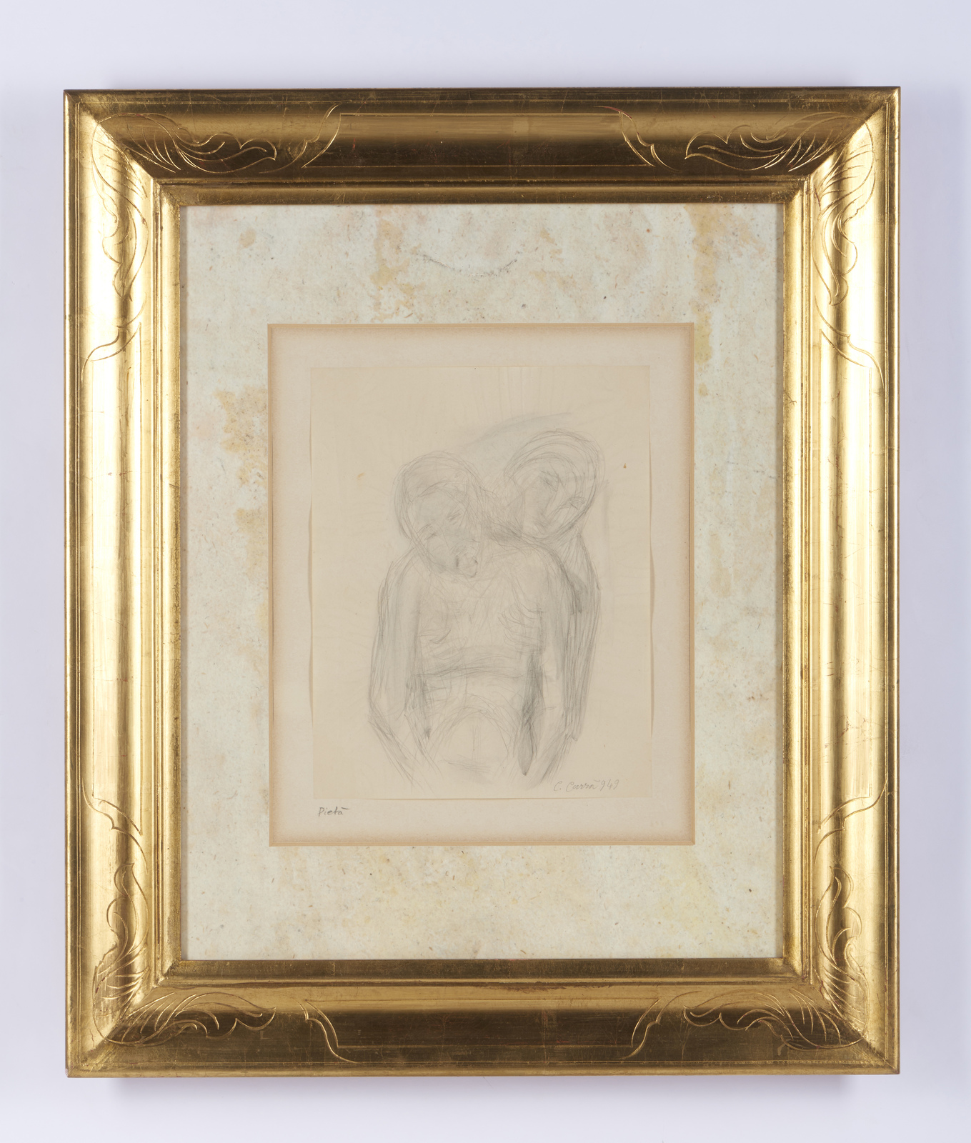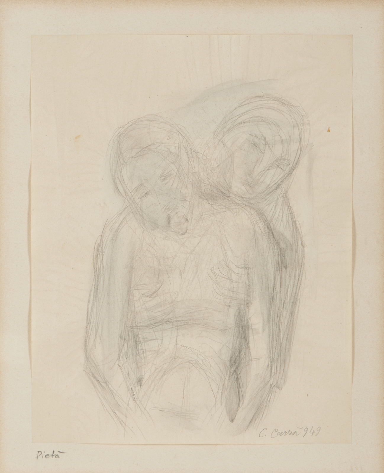 CARRA' CARLO (1881 - 1966) Pietà. 1949. Matita su carta. Cm 21,80 x 28,00. Firma e anno in in basso a destra. Pubblicazioni: Carlo Carrà. Disegni, a cura di F. Russoli e M. Carrà, Grafis, Bologna, 1977, n. 822. Provenienza: Collezione privata, Milano. . Cornice presente