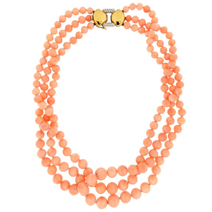 Collana composta da tre fili di boules di corallo rosa a scalare; chiusura in oro giallo con diamantini taglio