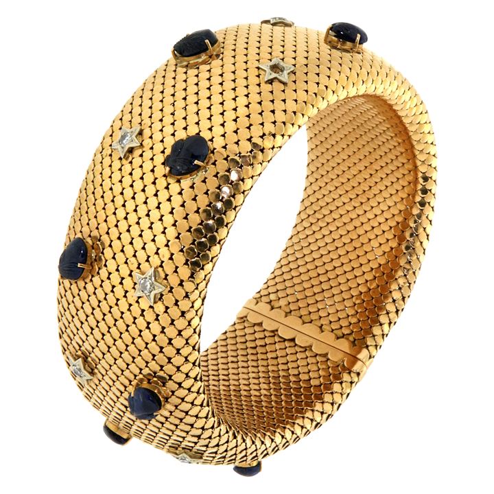 Bracciale semirigido in oro giallo, lavorato a scaglie,con zaffiri cabochon incisi (uno mancante) e stelle in oro bianco con diamanti taglio brillante e 8/8 per complessivi ct 0,60 (uno mancante)