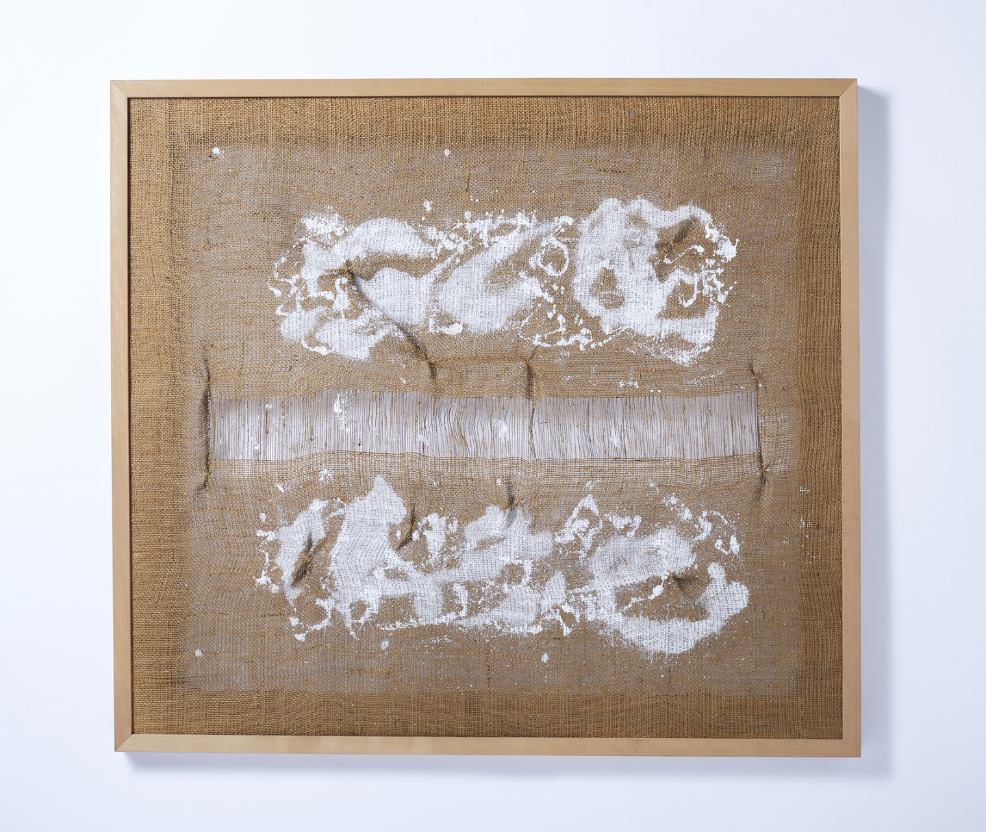EMBLEMA SALVATORE (1929 - 2006) Senza titolo. . 2002. Terra colorata su juta. Cm 100,00 x 90,00. Al retro firma e anno. Autentica dell'artista su fotografia (in cui è datata 2003). Certificato di provenienza Telemarket, Brescia. Pubblicazioni: Salvatore Emblema-Oltre la tela: gli orizzonti del creato, a cura di F. Boni, Edizioni Telemarket Communication, p. 318. Cornice presente