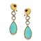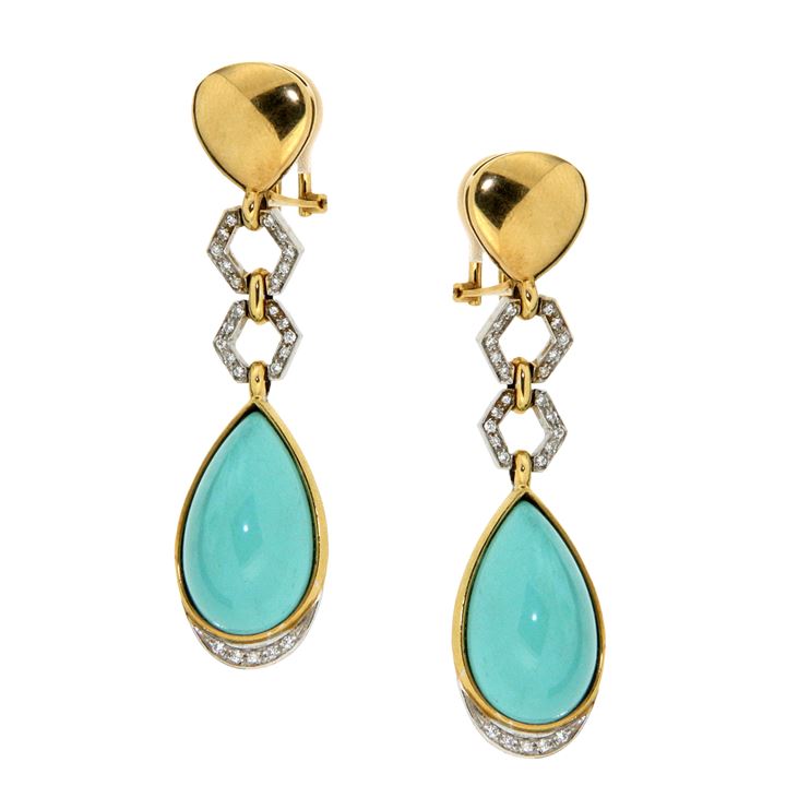 Coppia di orecchini in oro giallo con due gocce di turchesi pendenti e diamanti taglio brillante per complessivi ct 0,30 ca