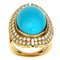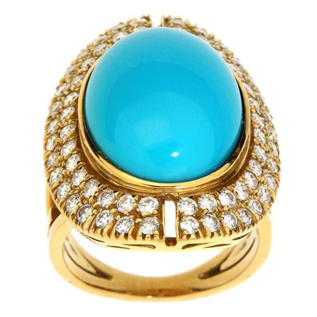 Anello in oro giallo, firmato "Repossi", sommità con turchese taglio ovale e doppio contorno di diamanti taglio brillante per complessivi ct 1,20 ca