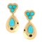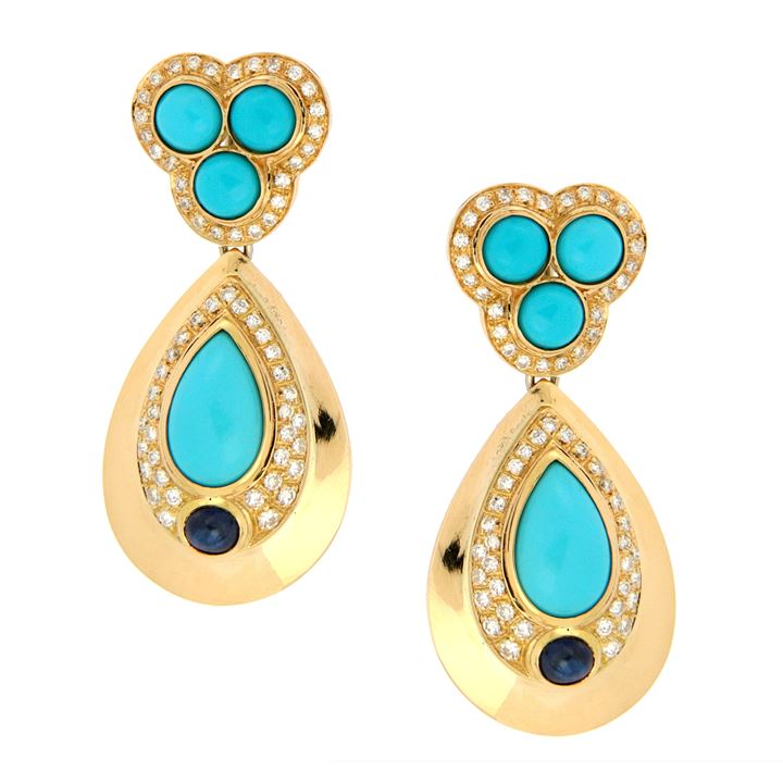 Coppia di orecchini pendenti in oro giallo, firmati "Repossi", con otto turchesi taglio rotondo e a goccia, due zaffiri cabochon; diamanti taglio brillante per complessivi ct 1,20 ca