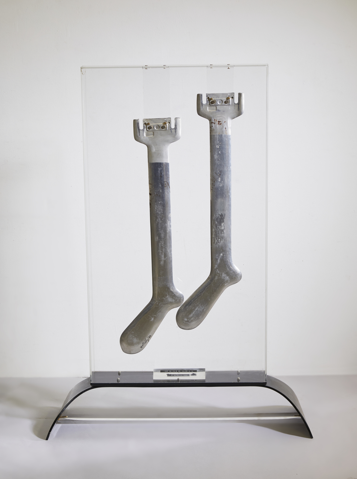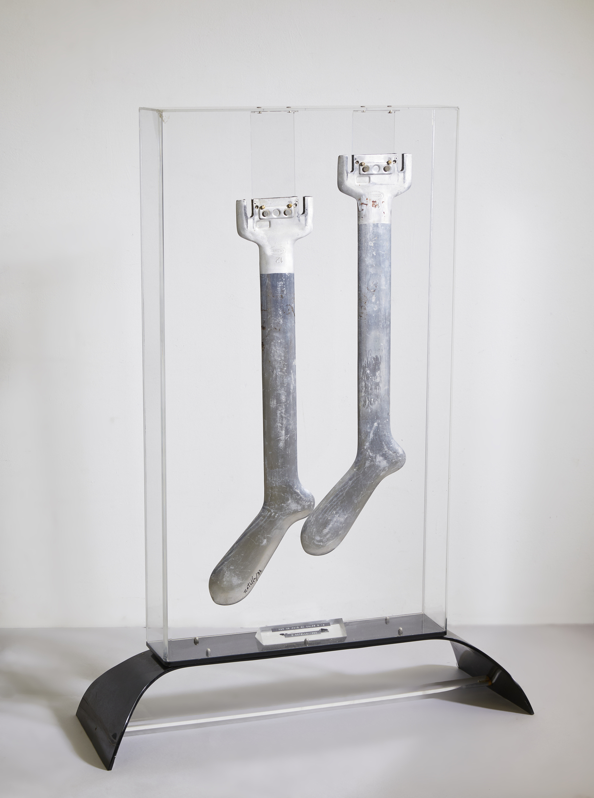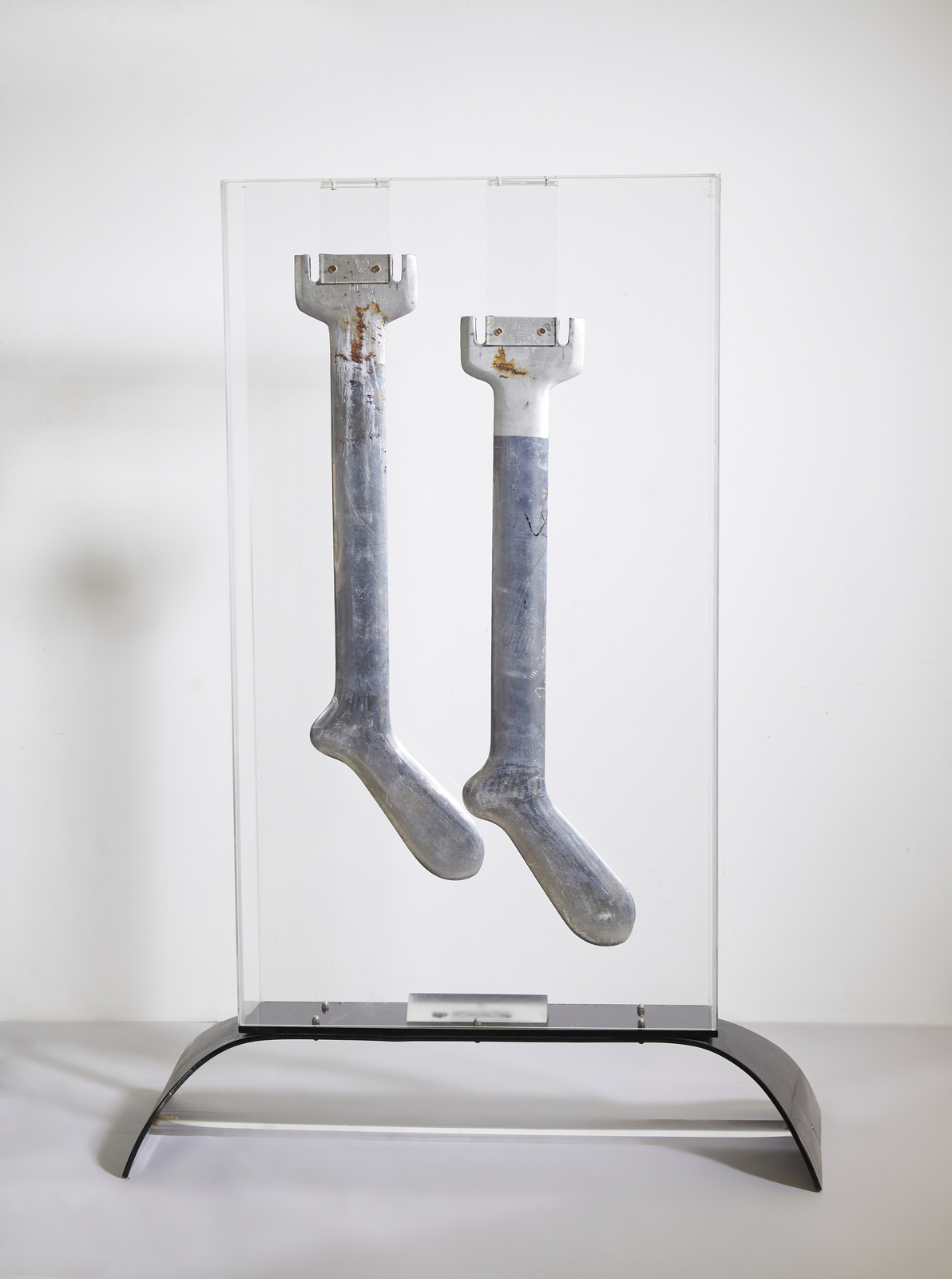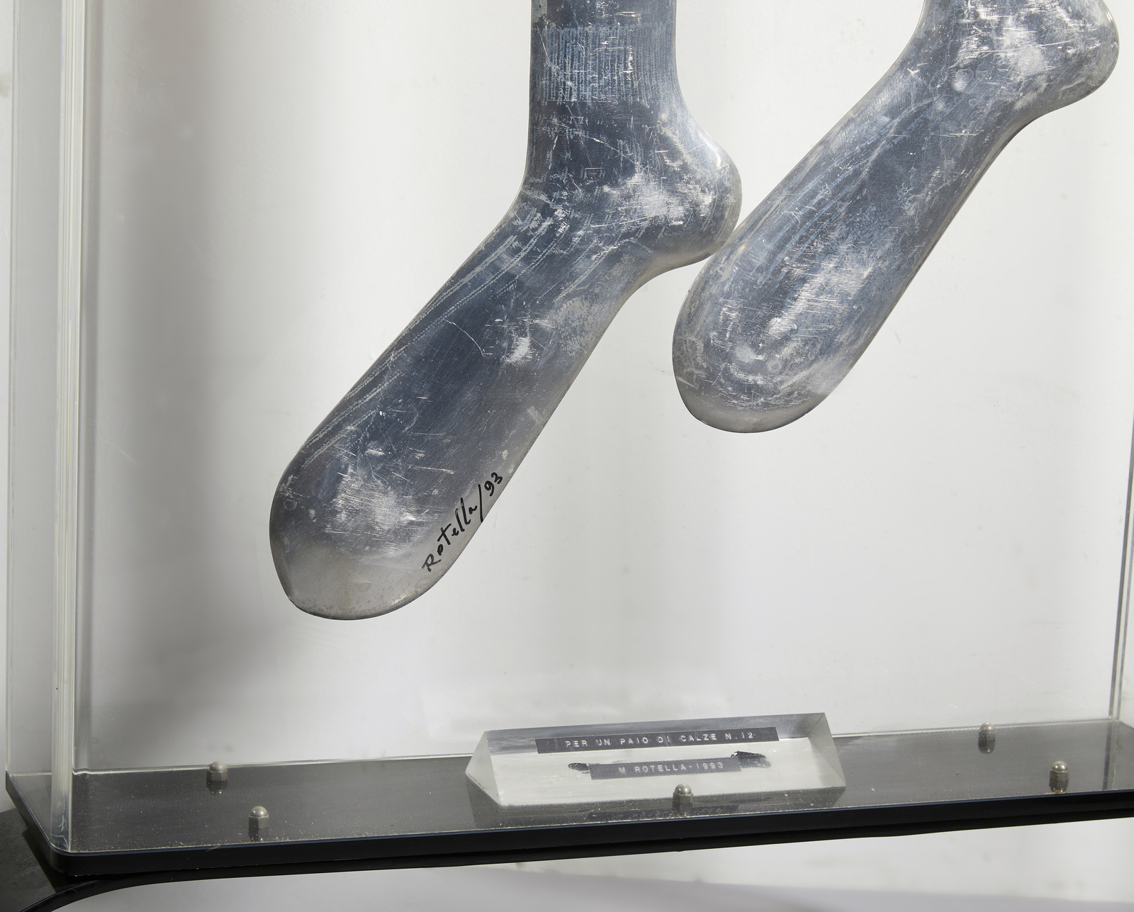 ROTELLA MIMMO (1918 - 2006) Per un paio di calze n. 12. 1993. Alluminio e plexiglass. Cm 100,00 x 138,00 x 15,00. Firma e anno in basso a pennarello. Opera archiviata presso la Fondazione Mimmo Rotella, Milano, come da documentazione fotografica allegata all'opera riportante il relativo numero d'inventario. Esposizioni: Reception di H&S Hosiery&Seamless Global Expo. Lievi difetti.