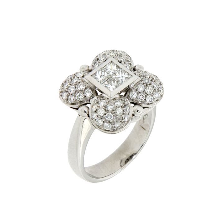 Anello in oro bianco, sommità a fiore, con diamanti taglio brillante e princess per complessivi ct 1,40 ca