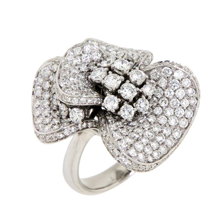 Anello in oro bianco, sommità a forma di fiore interamente in diamanti taglio brillante per complessivi ct 3,60 ca
