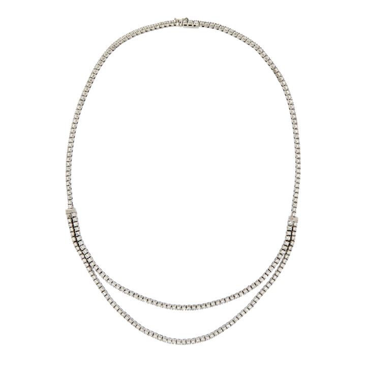 Girocollo in oro bianco, composto nella parte centrale da un doppio filo, interamente in diamanti taglio brillante per complessivi ct 8,30 ca, colore G, purezza IF-VVS