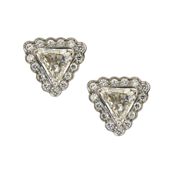 Coppia di orecchini in oro bianco, a lobo, di forma triangolare con due diamanti taglio eptagonale e a gradini per complessivi ct 2,90, colore K-L, purezza VS; trenta diamanti taglio brillante a contorno per complessivi ct 0,30 ca