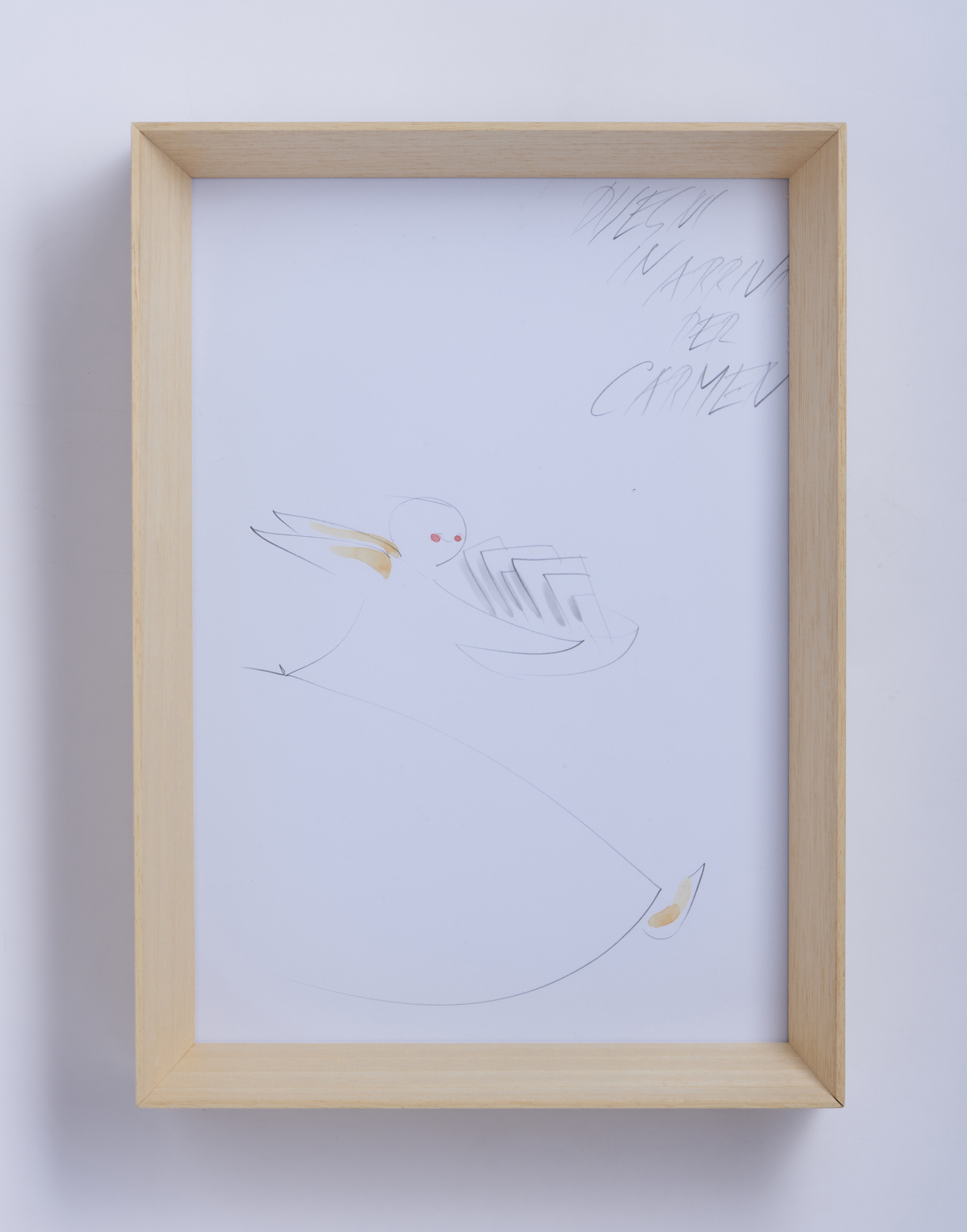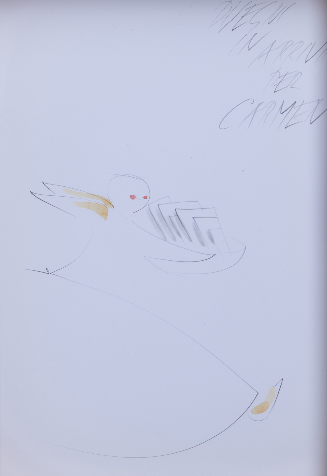 LICITRA PONTI LISA (1922 - 2019) Disegni in arrivo per Carmen. Tecnica mista su carta. Cm 21,00 x 30,00. Titolo in alto a sinistra. Sitografia: https://triennale.org/eventi/lisa-ponti-disegni-voci . Cornice presente