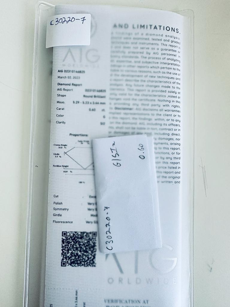 DIAMANTE 0,6 CARATI COLORE G - PUREZZA SI2 - TAGLIO BRILLANTE - CERTIFICATO AIG + INCISO AL LASER - C30220-7