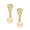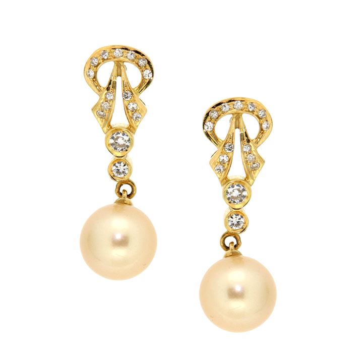 Coppia di orecchini pendenti in oro giallo: corpo a volute con diamanti taglio brillante per complessivi ct 0,35 ca terminante con due perle australiane, varietà gold