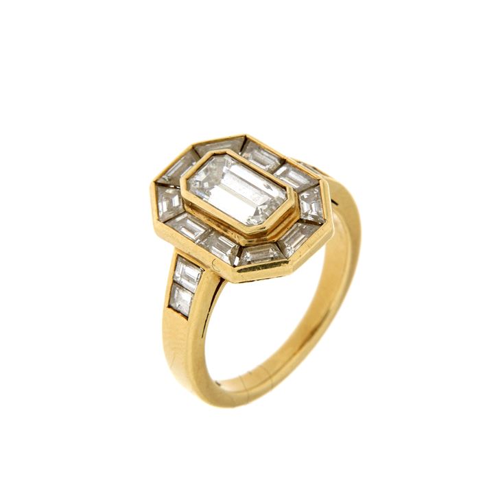 Anello in oro giallo con al centro diamante taglio baguette di ct 1,25 ca e contorno di diamanti taglio baguette per complessivi ct 0,70 ca