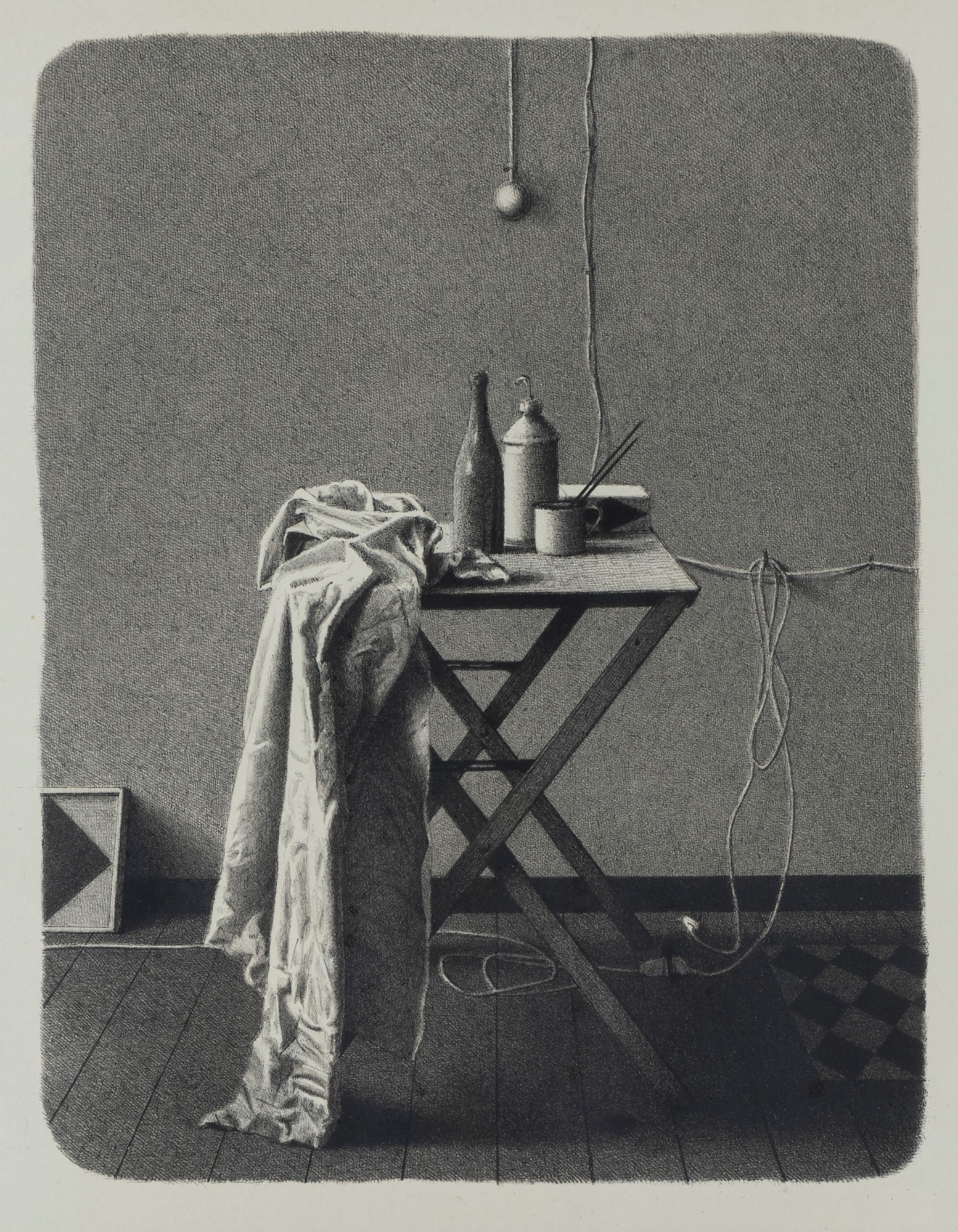 Gianfranco Ferroni (Livorno 1927-Bergamo 2001) - Interno con tavolino e grande straccio , 1981
