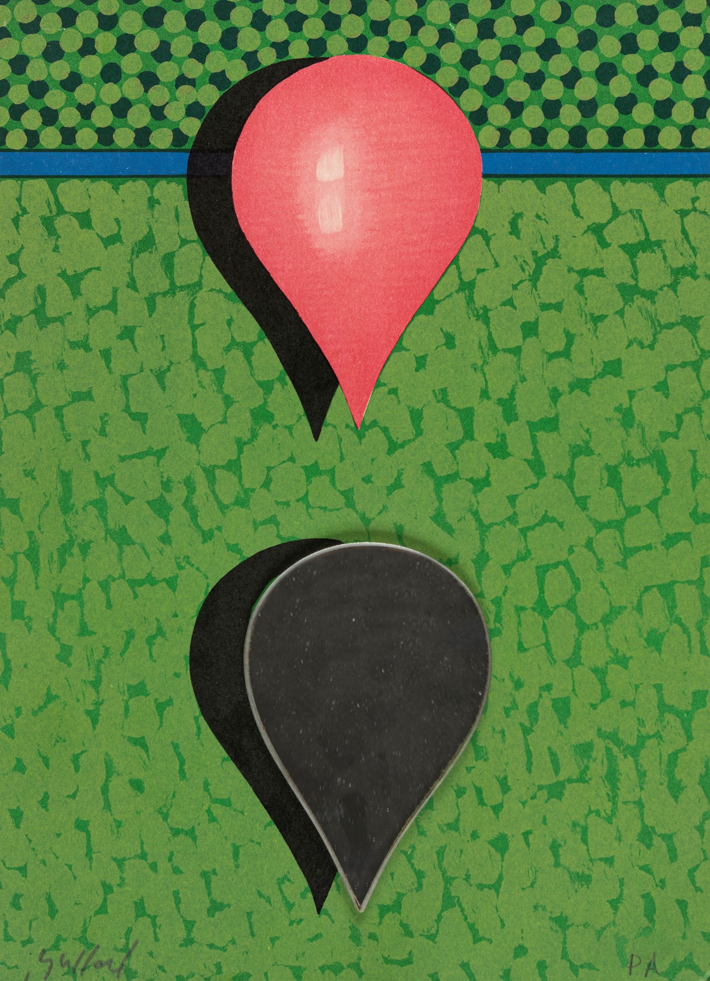 serigrafia a colori e collage con specchio su cartoncino, es. P.A.