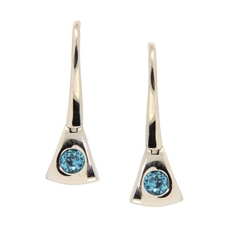 Coppia di orecchini in oro bianco, a monachella, struttura di forma geometrica con due topazi taglio rotondo al centro