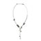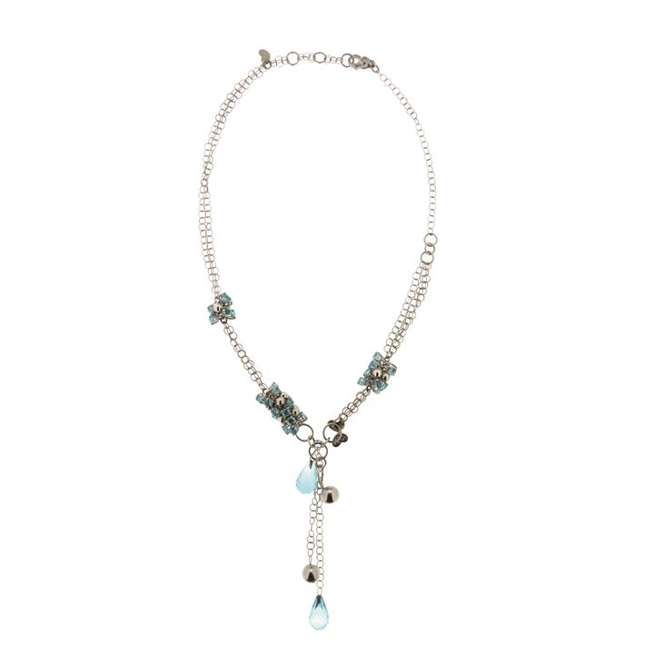 Girocollo in oro bianco composto da doppia catena ad anelli tondi recante topazi taglio rotondo disposti a festoni alternati a boules in oro bianco; nella parte centrale una sfera ed una farfallina in diamanti taglio brillante per complessivi ct 0,12 ca terminante con due sfere in oro bianco e due topazi taglio a goccia sfaccettati