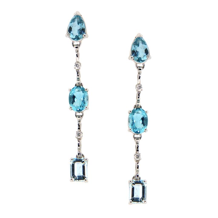 Coppia di orecchini pendenti in oro bianco con sei acquamarine taglio a goccia, ovale e rettangolare disposte in verticale, raccordate da piccoli diamanti taglio brillante per complessivi ct 0,06 ca