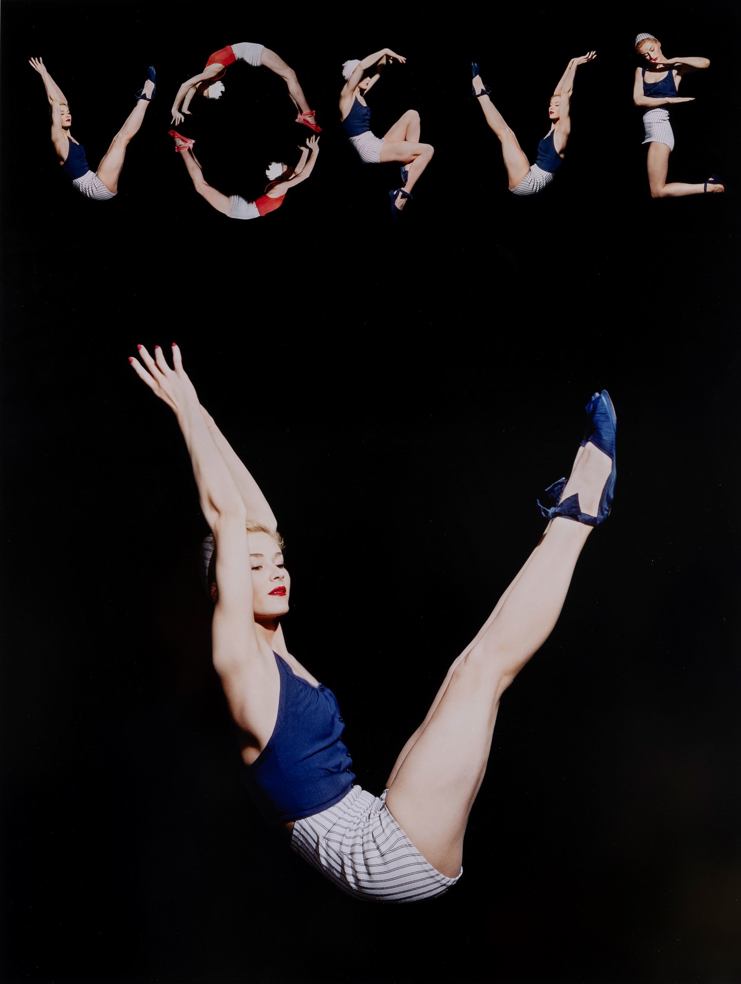 Siamo nel 1940 e come sempre l’art director di “Vogue” Mehemed Fehmy Agha è alla ricerca di una copertina originale per il numero di agosto. Sono ormai passati i tempi in cui si preferiva la più economica soluzione del bianco e nero e sono passati otto anni da quando Steichen inaugurò la prima copertina a colori con l’immagine di una ragazza in costume. Proprio da qui parte Agha scegliendo un’accoppiata di classe: un grande e raffinato fotografo come Horst e la modella allora più famosa, la svedese Lisa Fonssagrives, che dieci anni dopo avrebbe sposato Irving Penn. Su uno sfondo neutro su cui il costume da bagno blu poteva ben risaltare, Horst le chiede di assumere strane posture ognuna delle quali poteva comporre le cinque lettere del nome della rivista. Il risultato fu una delle più famose copertine della pur straordinaria storia di Vogue.