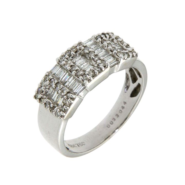 Anello in oro bianco, sommità di forma geometrica, con diamanti taglio brillante e baguette per complessivi ct 0,85 ca
