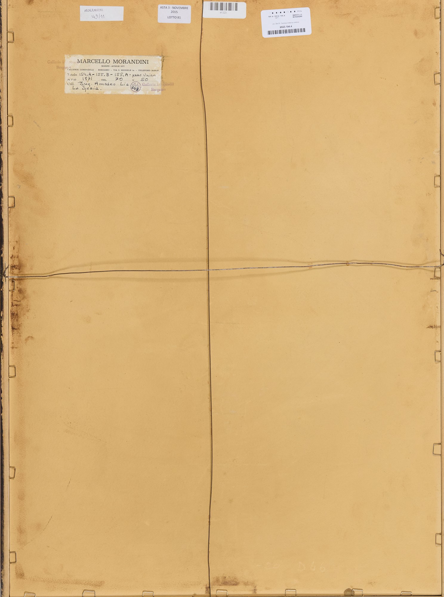 Sul verso: etichetta dell'Artista con descrizione.Timbri "Galleria Lorenzelli", Bergamo.