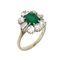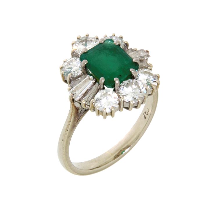Anello in oro bianco con al centro smeraldo taglio rettangolare, contorno di diamanti taglio brillante e baguette per complessivi ct 1,40 ca