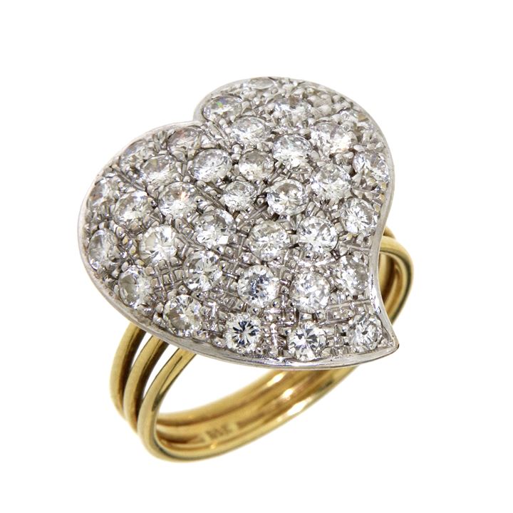 Anello in oro giallo, sommità in oro bianco, a forma di cuore interamente in pavé di diamanti taglio brillante per complessivi ct 1,60 ca
