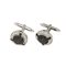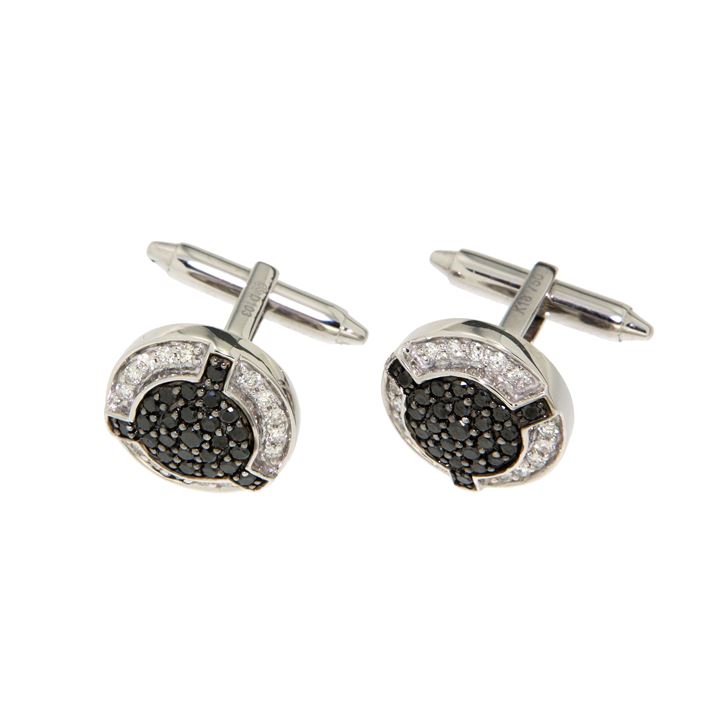 Coppia di gemelli in oro bianco di forma rotonda, sommità geometrica, con diamanti taglio brillante di colore bianco per complessivi ct 0,36 ca e neri per complessivi ct 0,67 ca