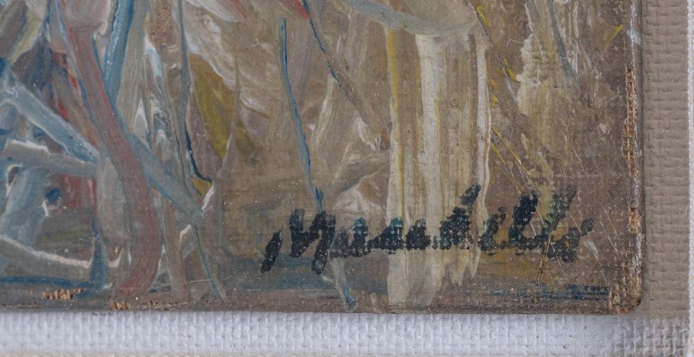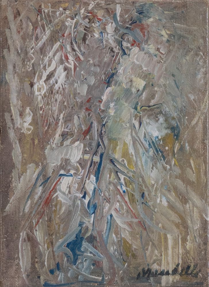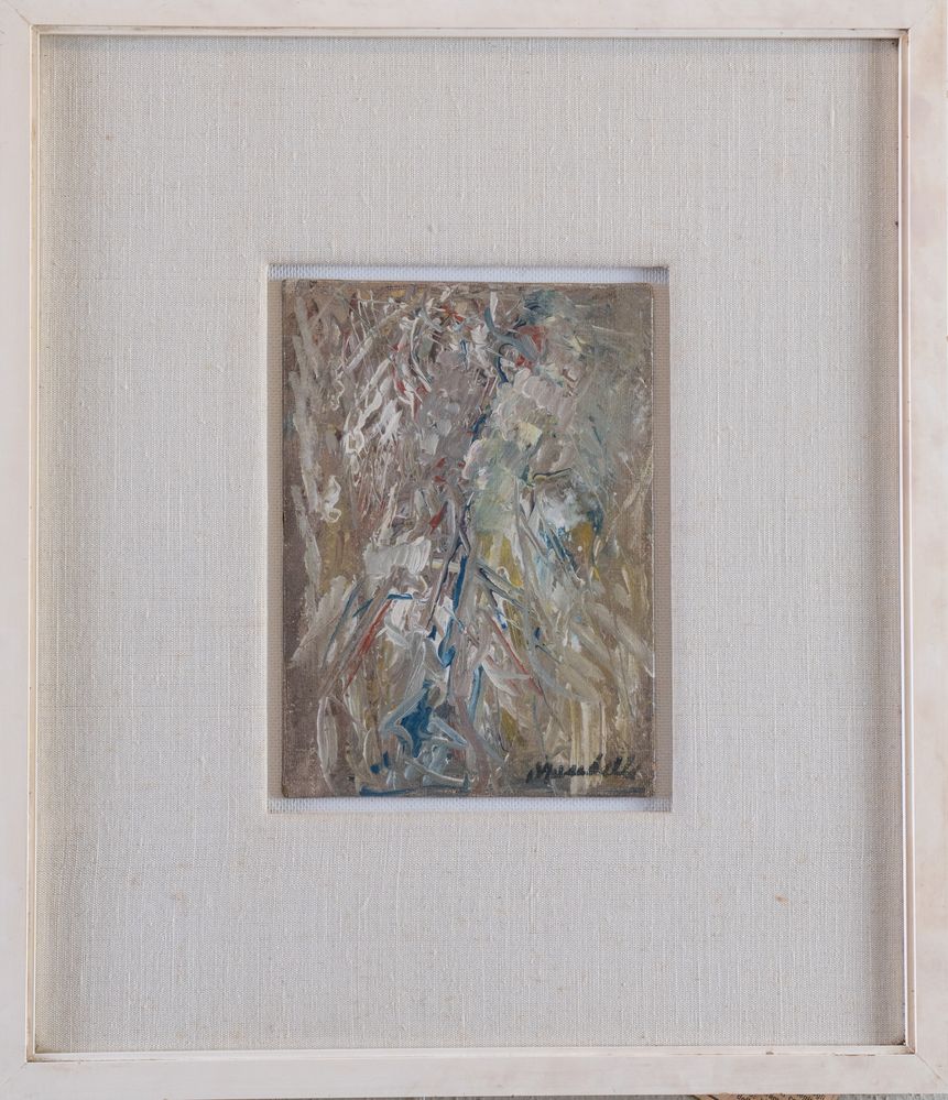 POMPILIO MANDELLI (Luzzara 1912 - Bologna 2006) "Figura", 1957. Olio su cartone telato. Cm 18x13. Opera firmata in basso a destra Mandelli.