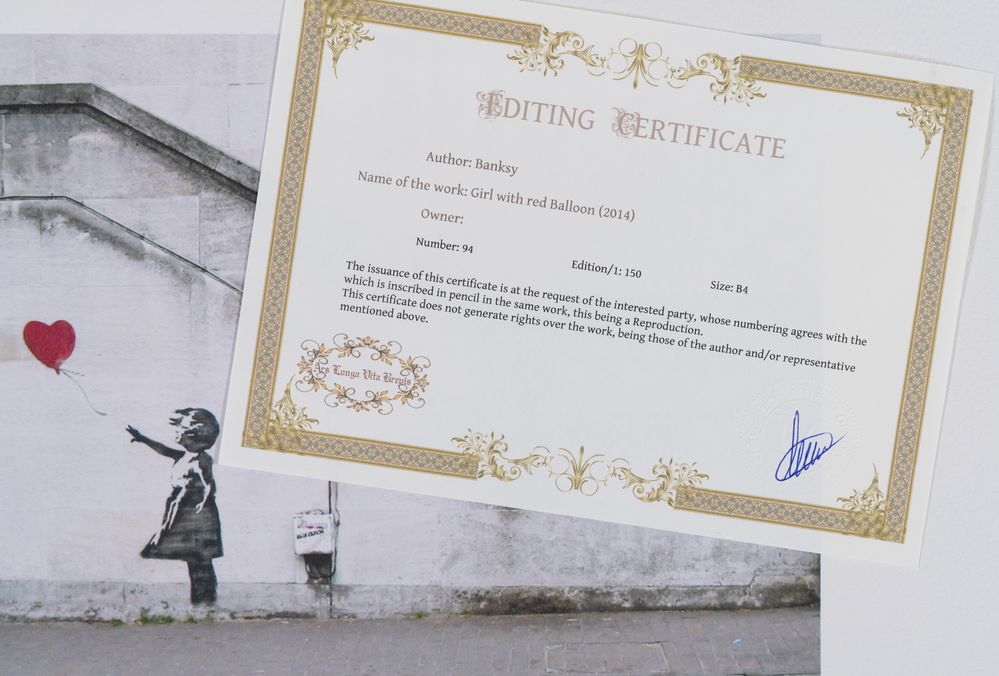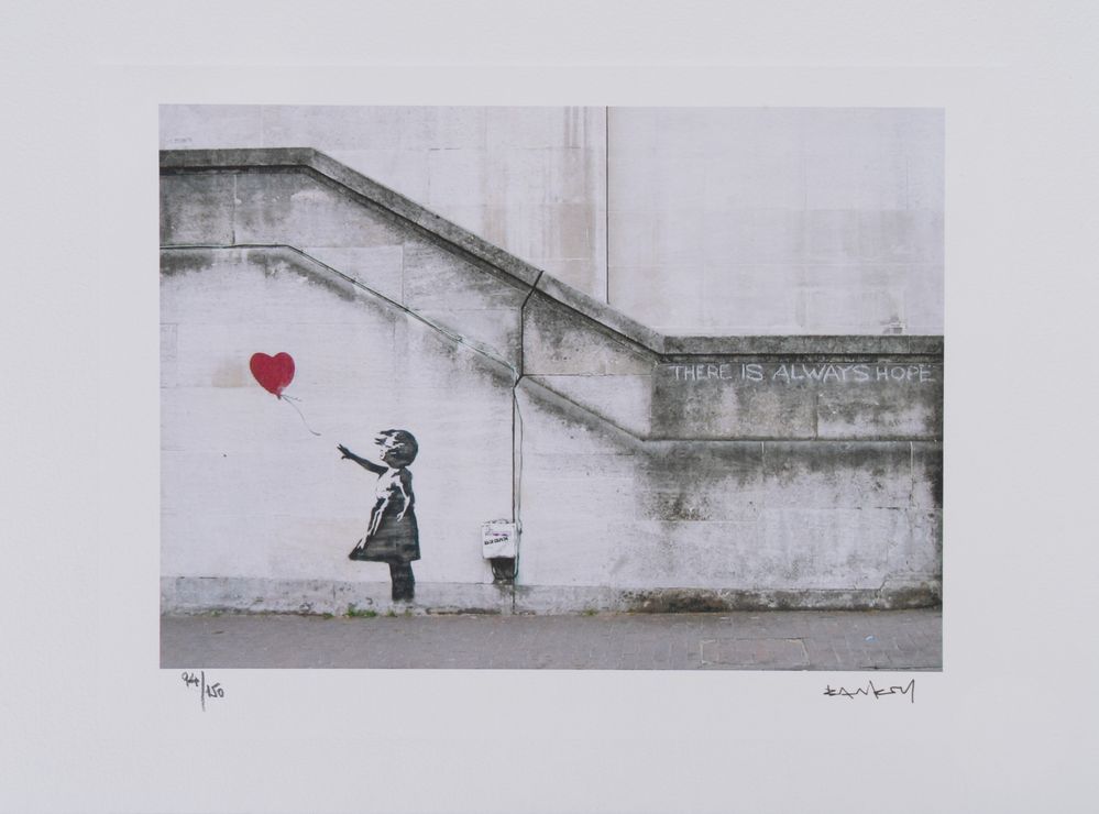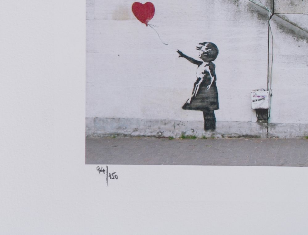 BANKSY (Bristol 1974), after. "Balloon girl". Litografia a colori su carta. Cm 28,5x38. Reca firma stampata in lastra in basso a destra Banksy. Reca numeri di tiratura in basso a sinistra 94/150. Reca in basso a destra timbro a secco di M Arts edition. Al retro reca sticker come certificato di autenticità di M Arts Edition. Opera accompagnata da certificato di autenticità di M Arts Edition.