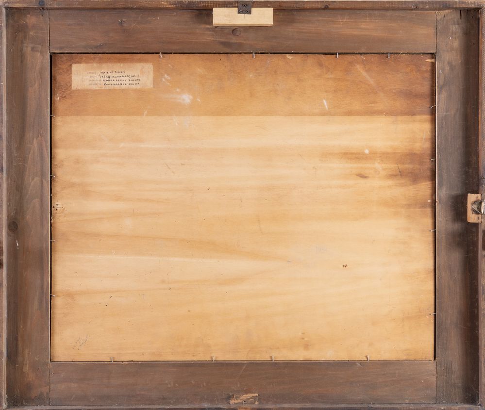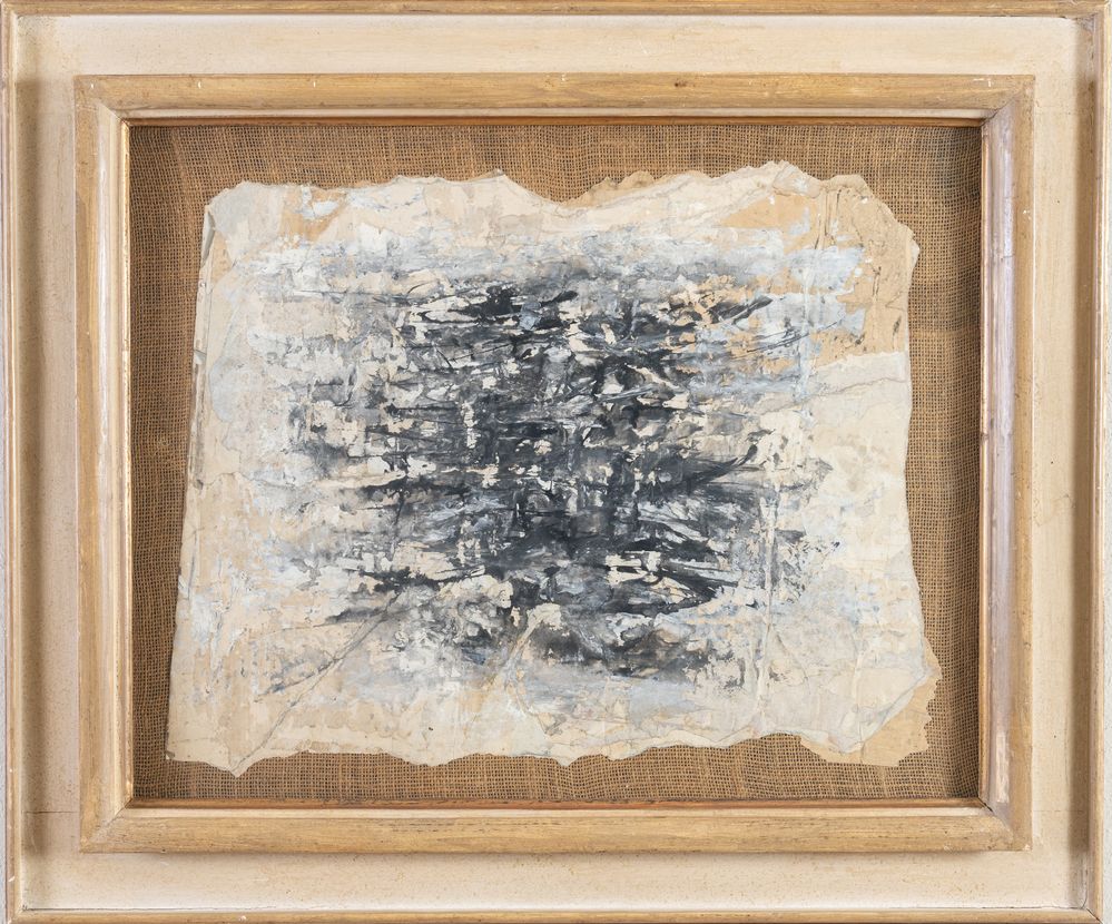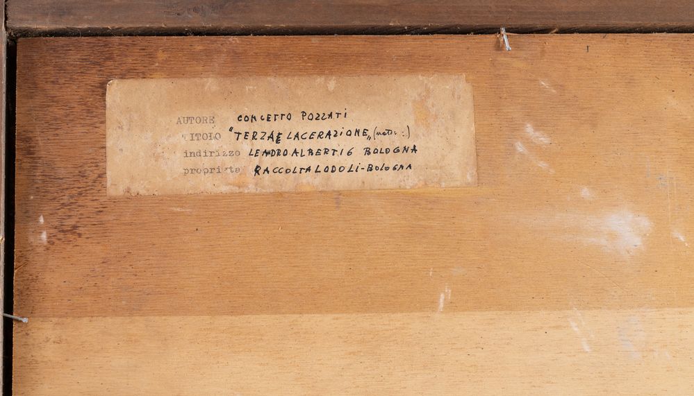 CONCETTO POZZATI (Vò 1935 - Bologna 2017) “Terza lacerazione”, anni ‘50. Olio su cartone su tela di juta applicata su tavola. Cm 57x70,5. Al retro reca etichetta di provenienza.