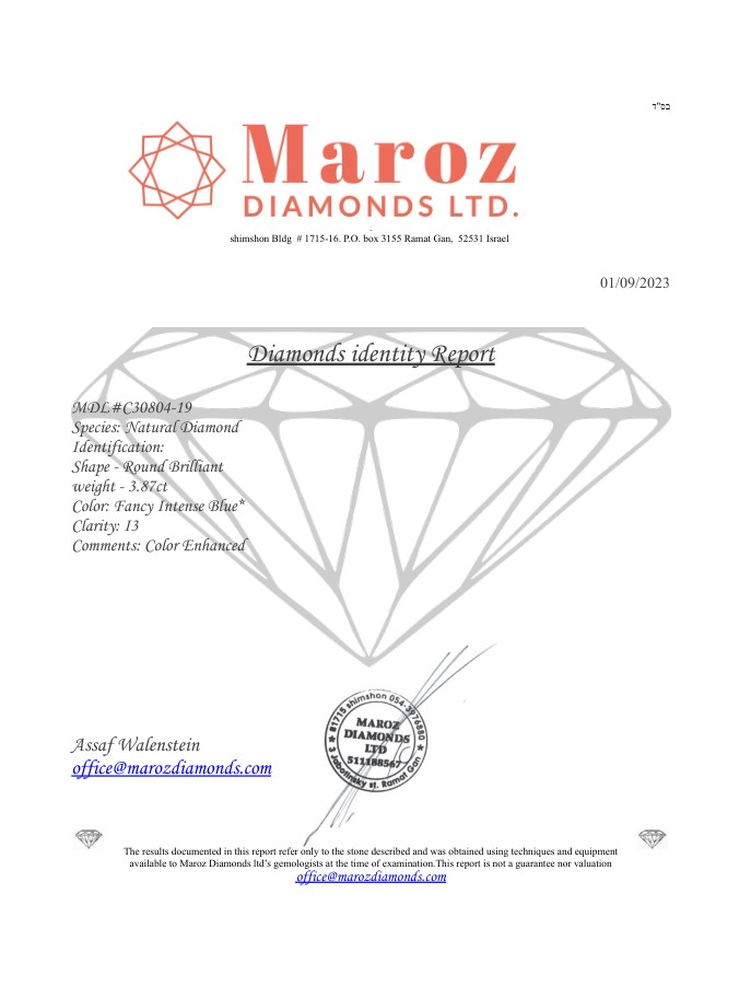 DIAMANTE COLORE ESALTATO 3,87 CARATI COLORE FANCY BLU INTENSO* - PUREZZA I3 - TAGLIO BRILLANTE - CERTIFICATO ID - C30804-19