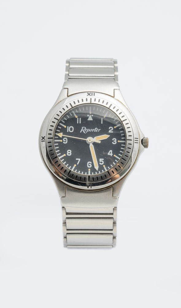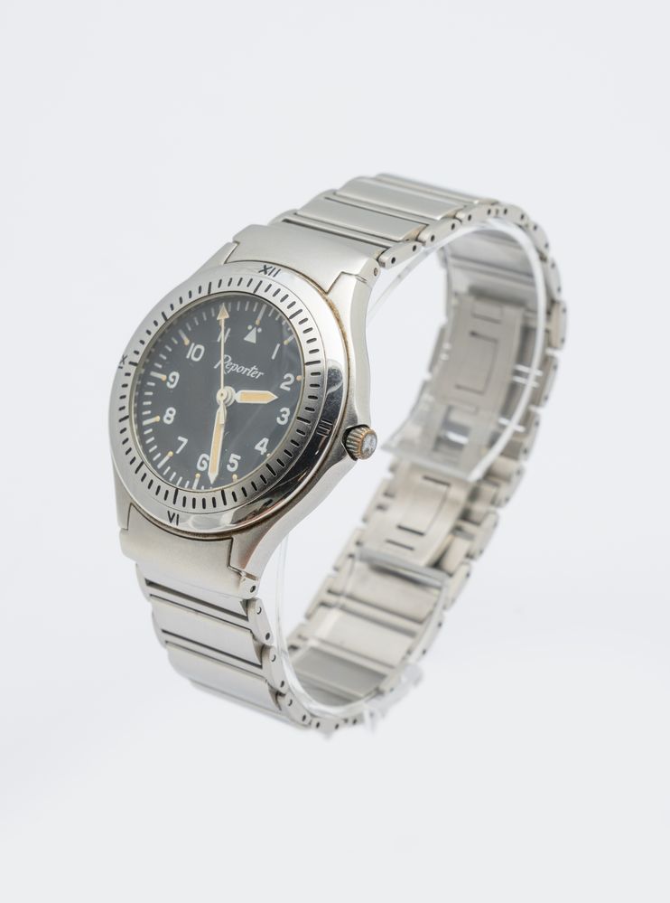 Reporter stile militare, anni 80 Cassa rotonda in acciaio. Quadrante nero,...