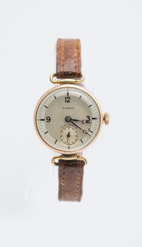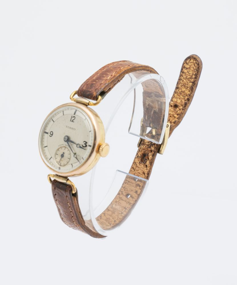 Tiano Trench Watch, anni 30 Cassa rotonda placcata oro, anse a cerniera...