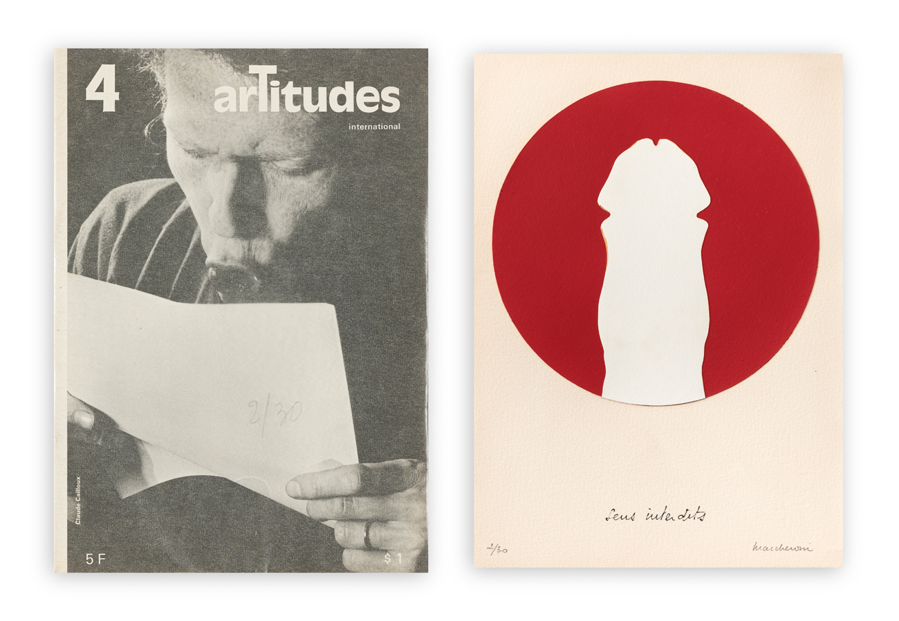 Numero 4 della rivista ArTitudes International diretta da François Pluchart contenente un multiplo a collage su cartoncini sovrapposti di Henri Maccheroni firmato e numerato (Esemplare 2/30) ed il poster "L'action picturale antamorphique, par Jean-Jacques Lauquin"
